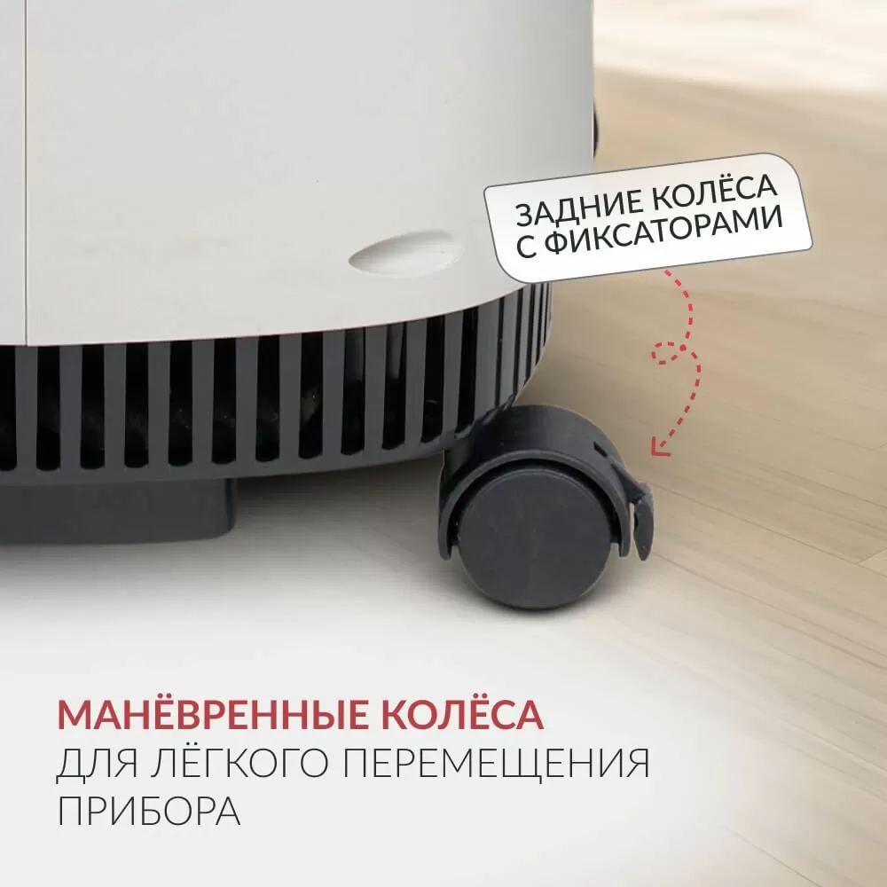 - Продуманная конструкция. Корпус изготовлен из ударопрочного пластика. Для удобства перемещения он оснащён ручкой и манёвренными колёсами, два из которых имеют фиксаторы. На задней поверхности корпуса крепится съёмный увлажнитель. В сочетании с системой фильтрации это обеспечивает подачу пациенту очищенной и увлажнённой кислородно-воздушной смеси, а значит — максимальную пользу от процедуры. Для визуального контроля уровня воды ёмкость увлажнителя изготовлена из прозрачного пластика.