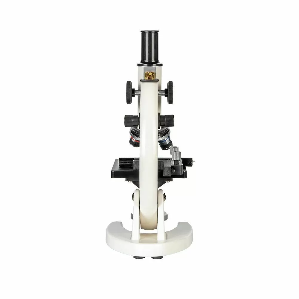 - Фокусировка микроскопа осуществляется перемещением по вертикали оптической головки вместе с объективами, окуляром и осветителем. Предметный столик при этом неподвижен. Механизм фокусировки имеет двухступенчатую конструкцию и обеспечивает как грубую, так и тонкую, прецизионную фокусировку. Наличие такого механизма у учебных микроскопов бюджетного класса большая редкость - как правило такими механизмами оснащаются профессиональные исследовательские микроскопы. Механизм снабжен рукоятками, выведенными на обе стороны штатива, и имеет ограничитель перемещения, что препятствует повреждению исследуемого образца и объектива.