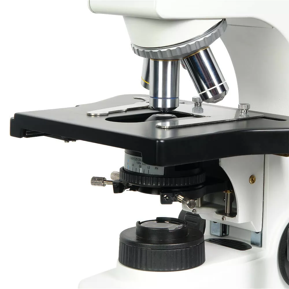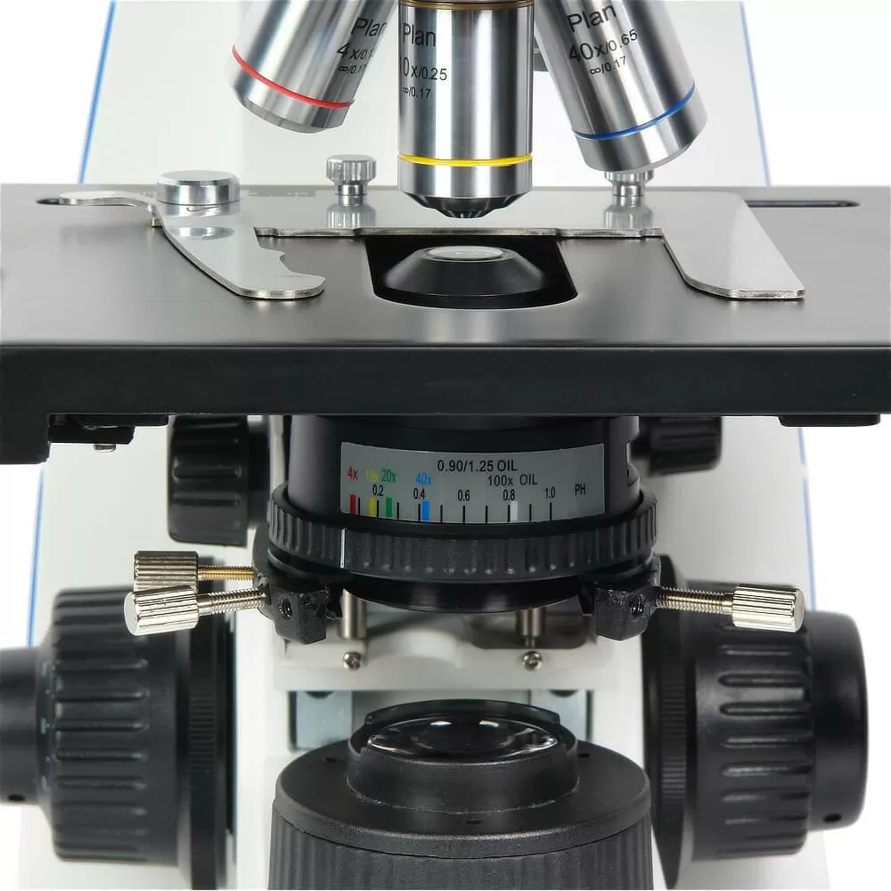 - В комплекте микроскопа - объективы с планахроматической коррекцией Plan 4x/0.13, Plan 10x/0.25, Plan 40x/0.65 и Plan 100x/1.25 oil. По дополнительному заказу микроскоп может быть укомплектован объективами Plan 20х/0.45, Plan 60х/0.80, флюоритовыми объективами Plan Fluor, объективами для работы в поляризованном свете SP POL и объективами фазового контраста Plan PH. Антигрибковое покрытие оптических поверхностей объективов позволяет без ограничений использовать микроскоп в биологических лабораториях.