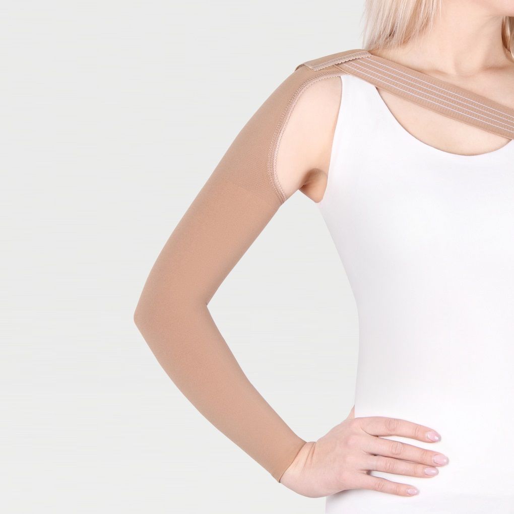 - Держась проблемной рукой за опору, другой рукой постепенно наложите рукав на плечо. Убедитесь в том, что изделие равномерно распределено на руке и не стесняет ее сгибание в локте;